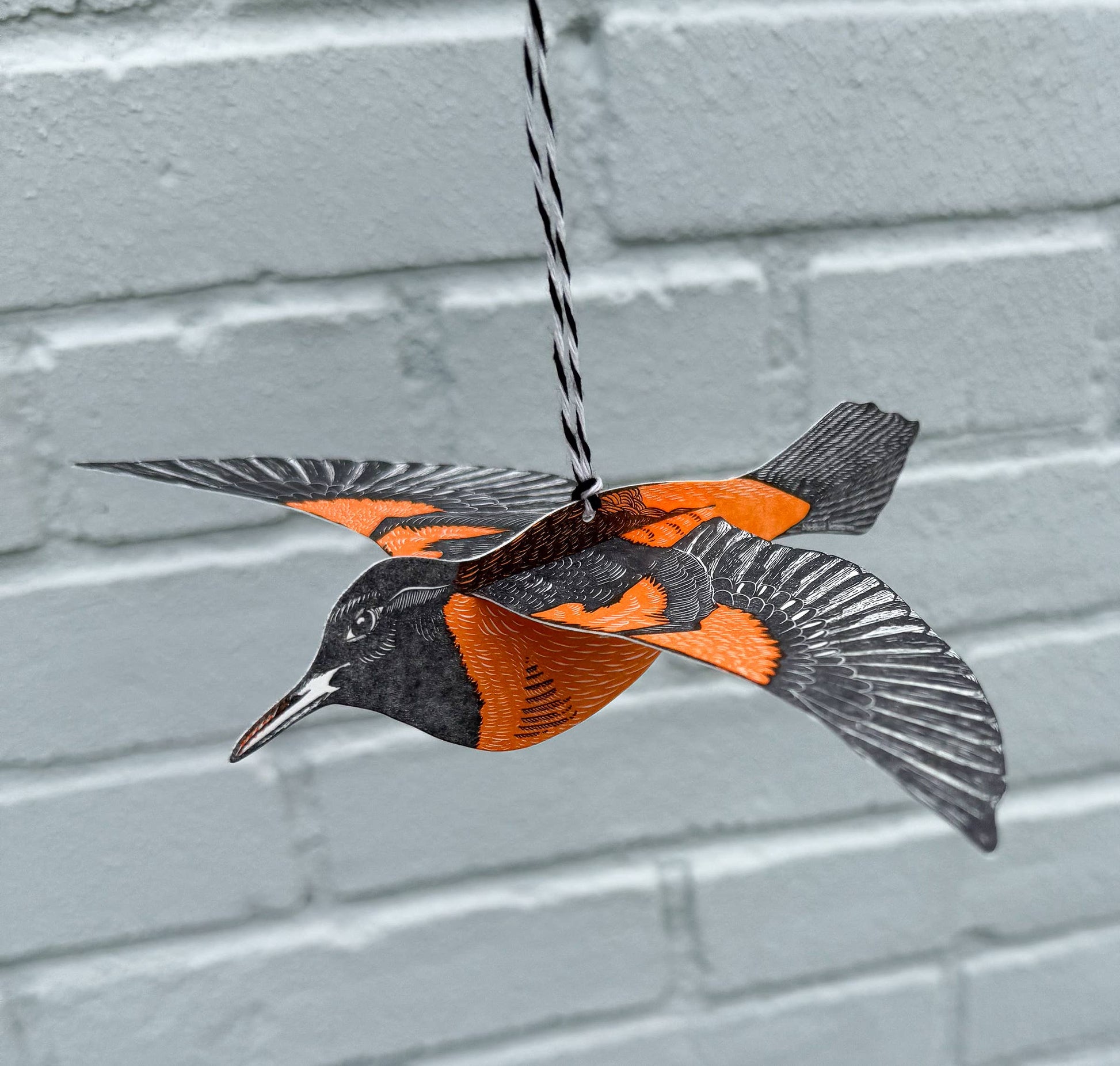 The Oriole Pop-Out Bird Card begins as a beautifully printed flat letterpress card, then transforms into a striking three-dimensional bird you can display or hang. Printed in bold black and bright orange inks on soft 100% cotton paper, each oriole is die-cut for easy pop-out assembly and comes with a hanging string for effortless display.